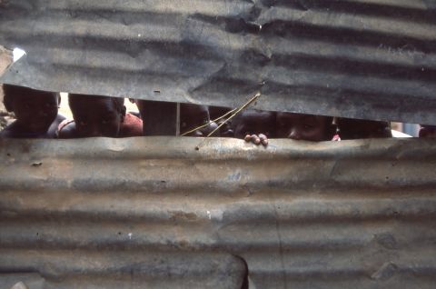 Children in Sambizanga musseque peek through metal fence