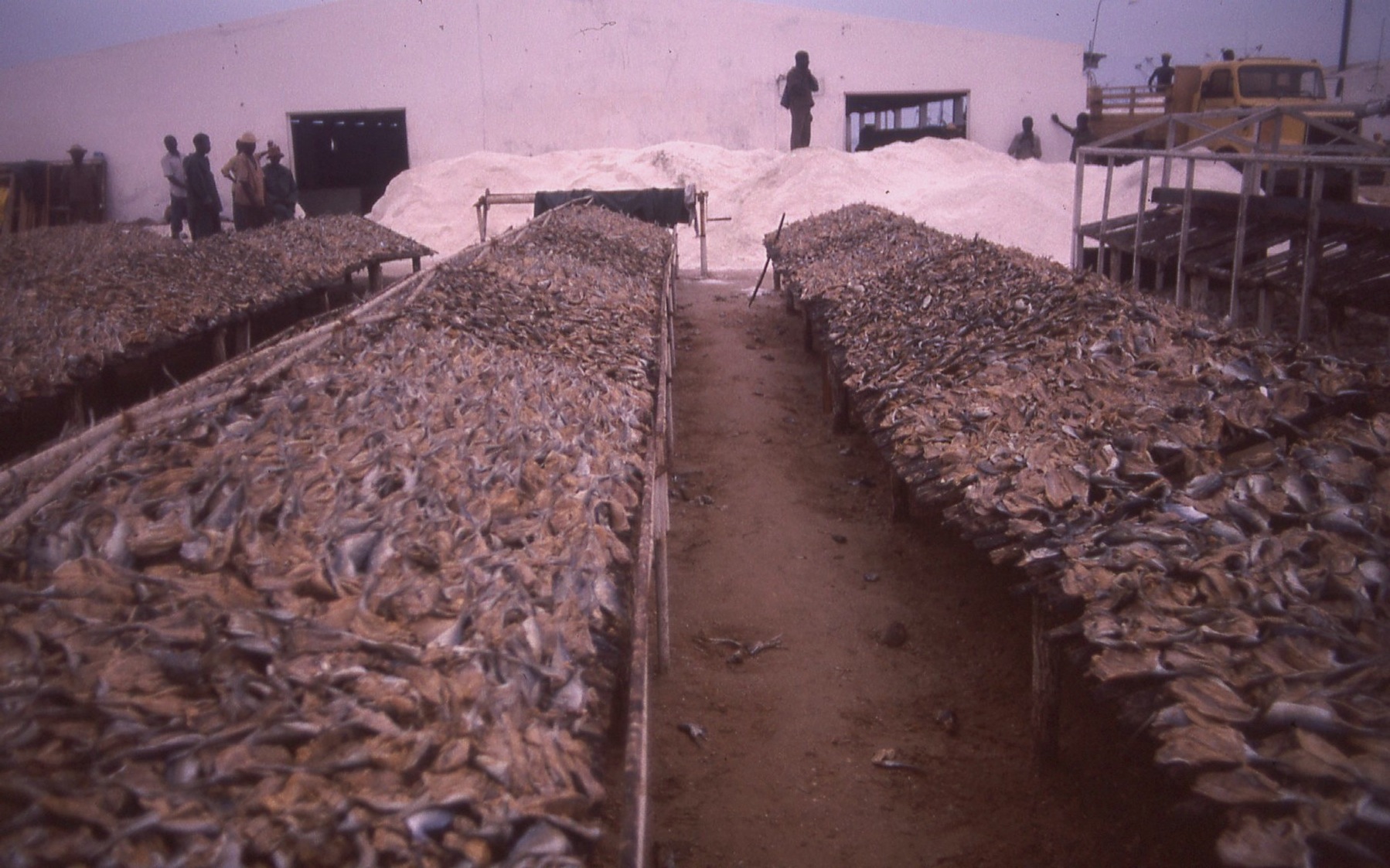 Large quantities of fish drying outside on table