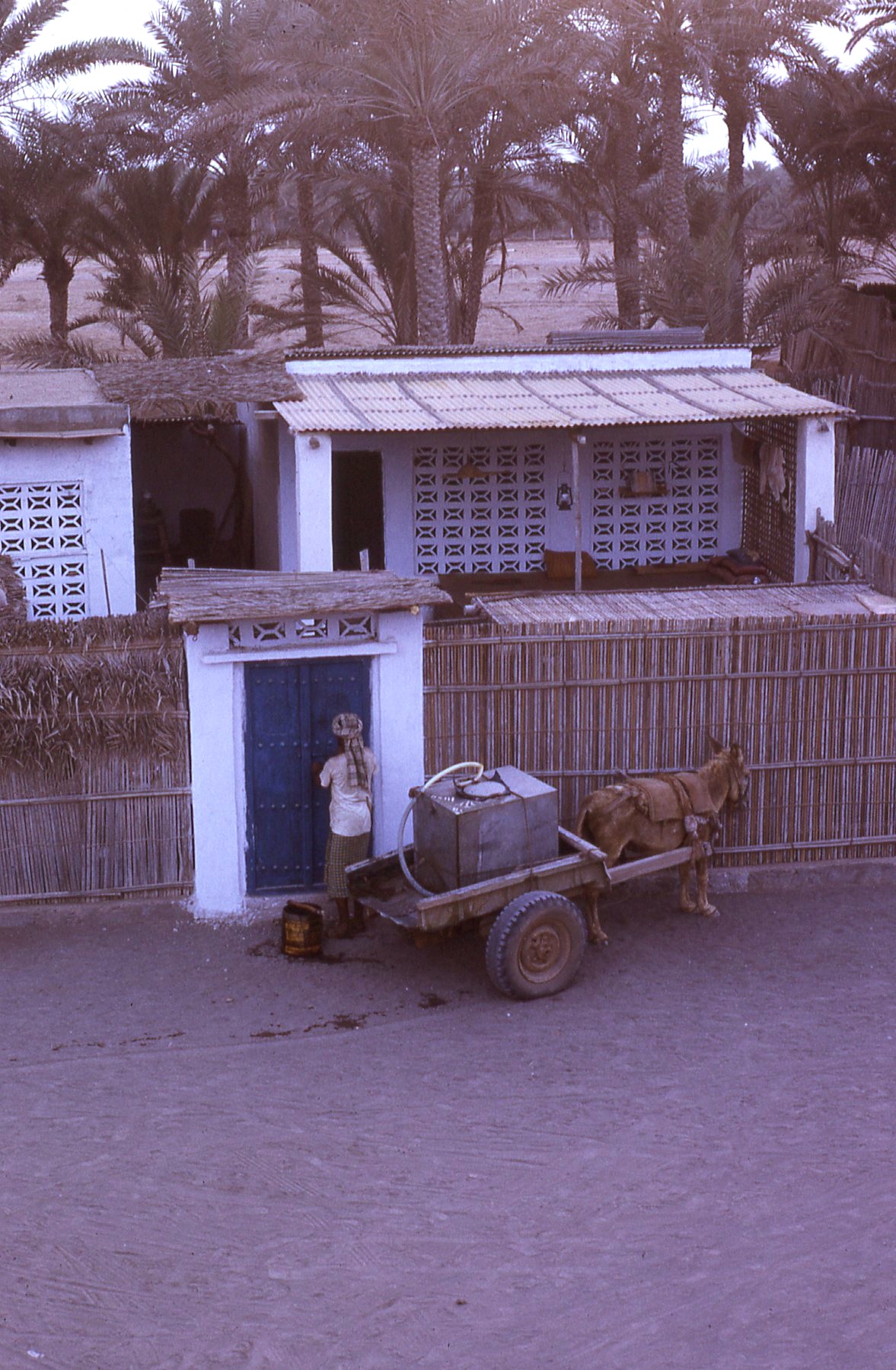 Man with cart and donkey; fencing made of palm frond stems (barasti)