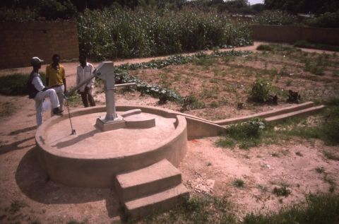 Men standing next to well and planted field