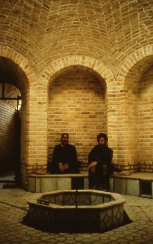 Men seated; interior brick area